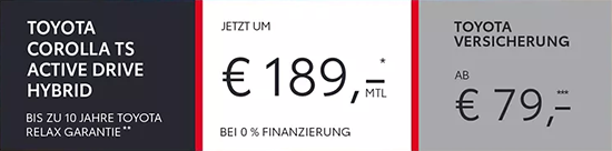 *Berechnungsbeispiel am Modell Toyota Corolla TS 1,8 Hybrid Active Drive. Unverbindlich empfohlener Fahrzeuglistenpreis: € 29.590,00 abzgl. unverbindlich empfohlener Finanzierungsstütze (Rabatt) von € 500,00 (inkl. Händlerbeteiligung), ergibt einen unverbindlich empfohlenen Kaufpreis von € 29.090,00. Davon ausgehend: Anzahlung: € 5.918,00; Gesamtkreditbetrag: € 23.172,00; 47 monatliche Kreditraten à € 189,00; einmalige Schlusskreditrate € 14.289,14; zu bezahlender Gesamtbetrag daher: € 23.172,14; Kreditvertragslaufzeit: 48 Monate; fixer Sollzins: 0%; effektiver Jahreszins: 0%. Unverbindliches Finanzierungsangebot der Toyota Kreditbank GmbH Zweigniederlassung Österreich, Wienerbergstraße 11, 1100 Wien. Gültig bei allen teilnehmenden Toyota Vertragshändlern bei Anfrage und Vertragsabschluss bis zum 30.06.2022. Angebot freibleibend. Keine Barablöse möglich. Änderungen, Satz- und Druckfehler vorbehalten. Alle Werte inklusive NoVA und USt.